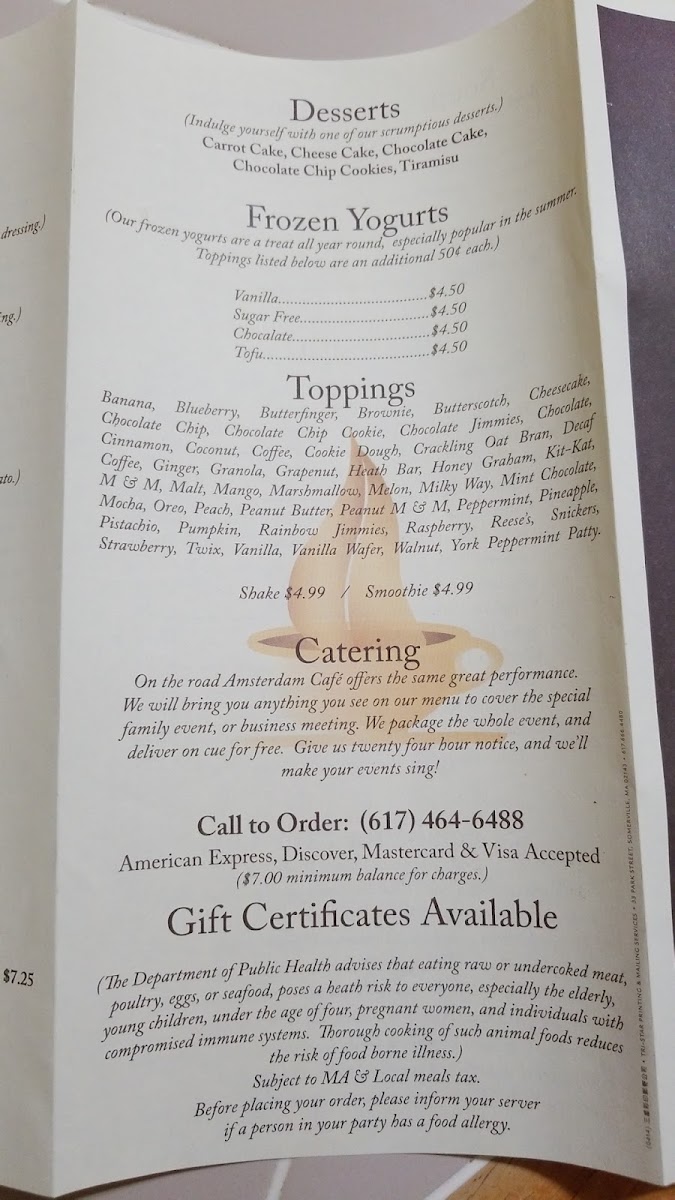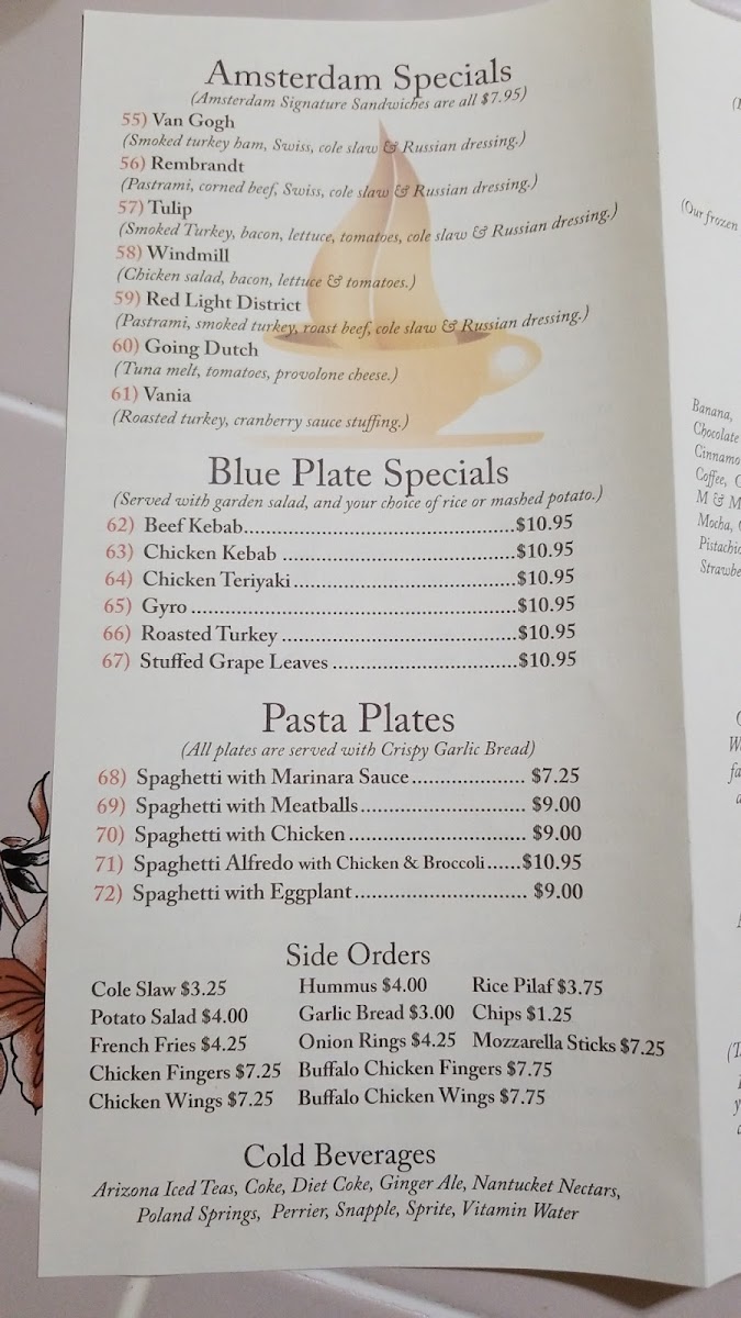Welcome to Amsterdam Cafe, your new favorite neighborhood spot located at 483 E Broadway, South Boston. This cozy cafe offers a delightful menu packed with vibrant flavors and hearty portions. From savory Pita Roll-Ups to enticing Dinner Plate Specials, there's something to satisfy every craving.